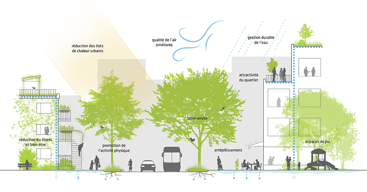 Ces avantages découlent en large partie des bienfaits et des services écosystémiques apportés par les végétaux en milieu urbain, surtout par les arbres à grand déploiement (Gosselin, 2015; Lafontaine-Messier et collab., 2010) qui: