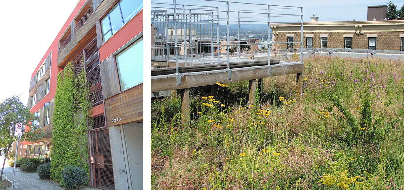 Plantes grimpantes sur une cage d'escalier et toit végétalisé. Source: Vivre en Ville.