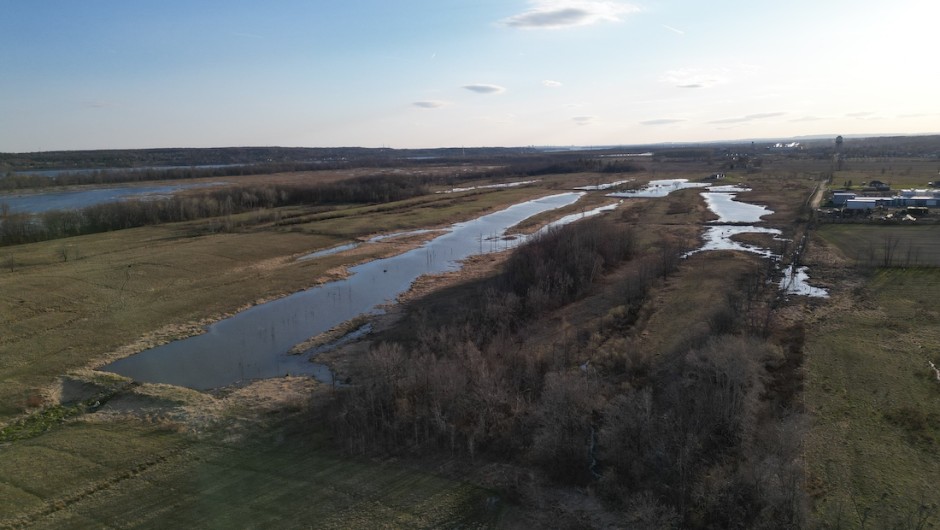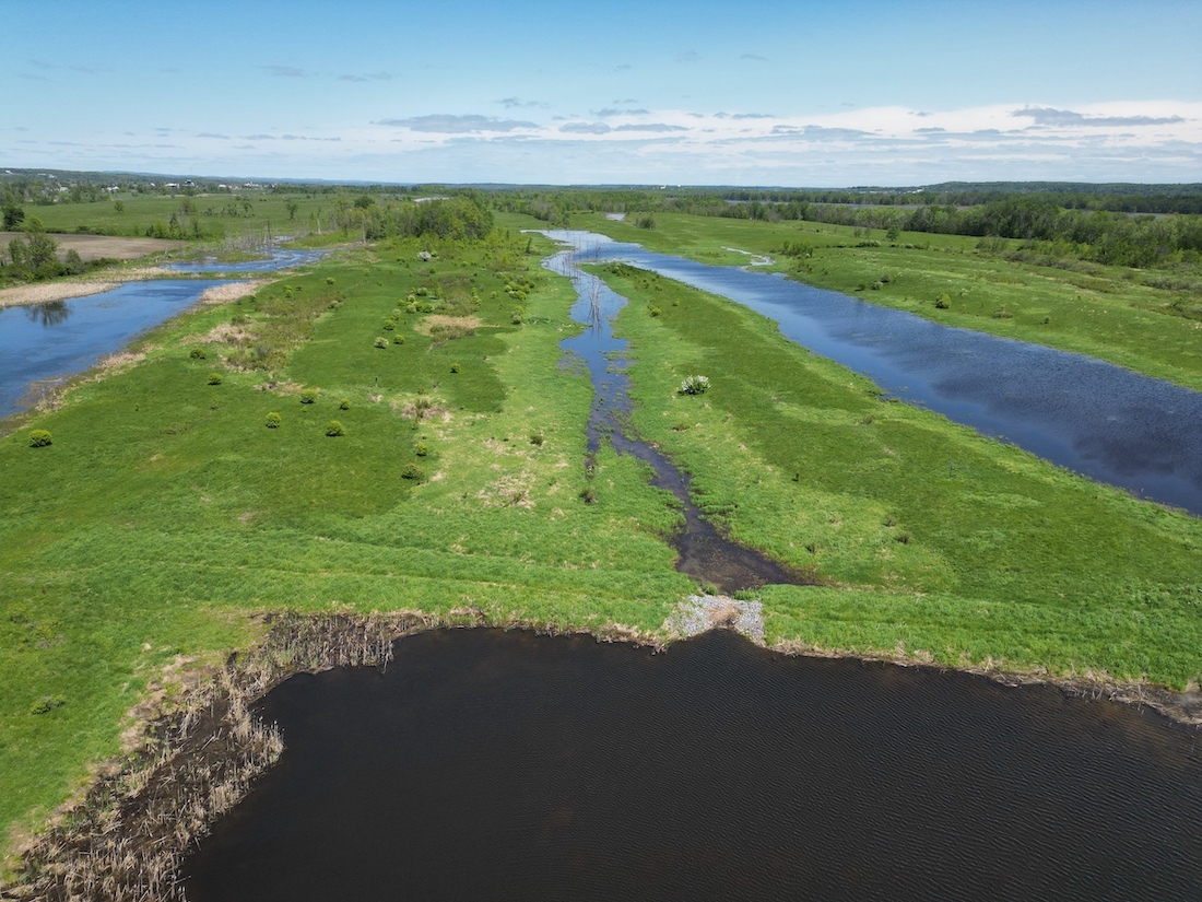 Située en bordure de la rivière des Outaouais, particulièrement sujette aux inondations printanières, la création de marais a été une solution gagnant-gagnant et innovante pour des terres agricoles marginales qui faisaient face à des enjeux de drainage et de déprédation (surconsommation) des prairies fourragères par la bernache du Canada.
