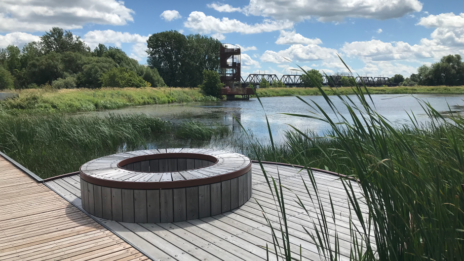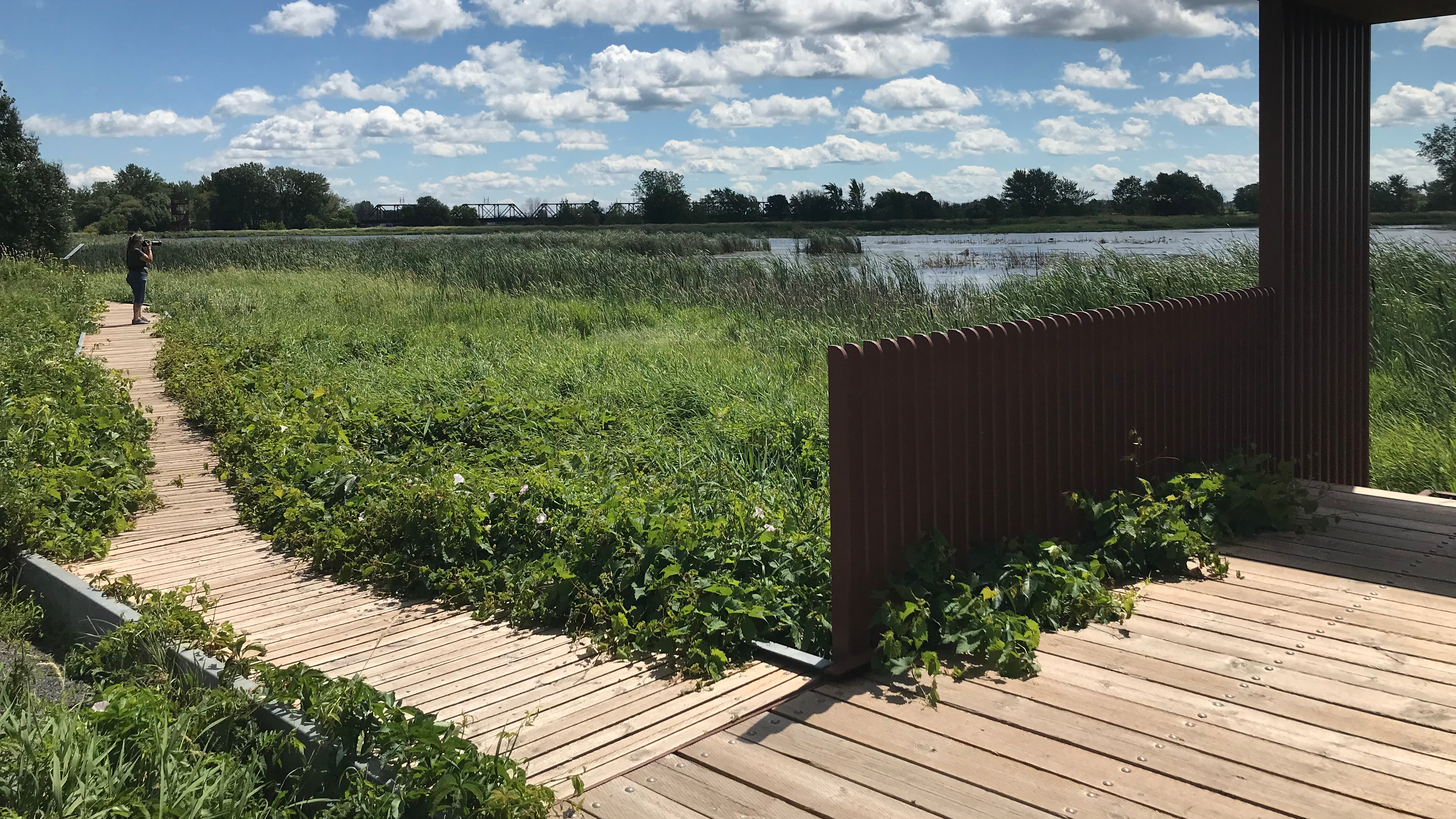 Aux termes du projet, trois grands secteurs ont été aménagés dans la zone inondable aux abords de la rivière des Prairies, près de la rue Bernard-Gagnon et du chemin Saint-Charles, en plus de la digue de 1,6 kilomètre. Un marais d’environ 45 hectares, un marécage et un secteur forestier, où est réimplantée l’érablière argentée d’origine, sont aménagés sur plus de 100 hectares. Pour rendre le site accessible au public, des sentiers balisés, des belvédères, une passerelle sur pilotis de 550 mètres pour accéder à une tour d’observation de seize mètres de hauteur, des abris et aires de repos, un stationnement, ainsi que quelques panneaux d’interprétation ont été aménagés. Conçues pour être résilientes face aux inondations, les infrastructures ont été implantées de manière à respecter la fragilité du milieu et à minimiser l’empreinte, notamment en priorisant la préfabrication en atelier et en modulant les travaux en fonction des périodes de restriction environnementale. Le projet a remporté le Grand prix du design dans la discipline Paysage et Territoires.